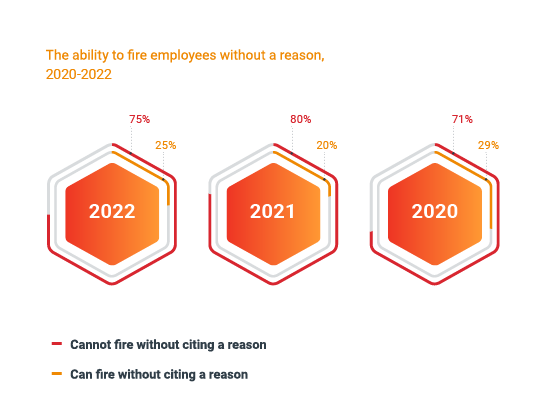 With labour laws often titled strongly in favour of the individual, organisations need to adhere to strict processes for hiring new employees, as well as for terminations, whether voluntary or involuntary.Infographic of the ability to fire employees without a reason