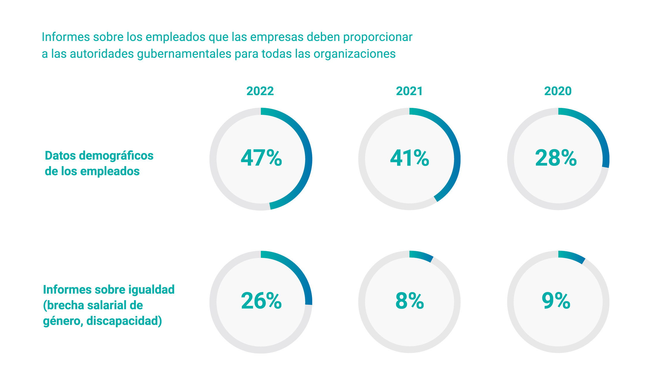 Las empresas también están obligadas a presentar informes y datos relacionados con la igualdad, que abarcan áreas como la brecha salarial de género y la discapacidad, en más jurisdicciones: hasta el 26 % en 2022 desde el 9 % en 2020.