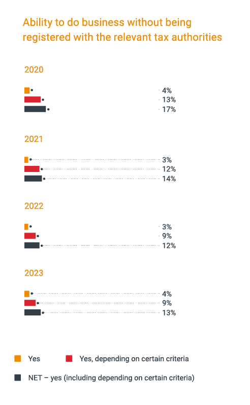 Year on year, accounting and tax rules are becoming more stringent. For example, it’s now less common to be able to do business without being registered with relevant tax authorities: this is only possible in 13% of jurisdictions globally in 2023. This includes those jurisdictions like the Cayman Islands and the US where doing business is typically simpler and governments actively work to make all stages of business incorporation and operation as straightforward as possible.