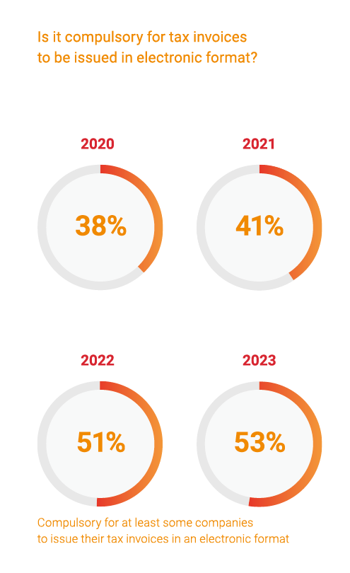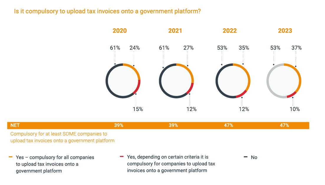 Since 2020, it has become more and more common for governments to mandate the issuing and uploading of tax invoices digitally. For instance, in 2020 just 38% of jurisdictions required at least some organisations to issue tax invoices electronically, rising to 53% in 2023. Similarly, in 2020, only 24% of jurisdictions mandated that all organisations must upload tax invoices to a government platform, rising to 37% in 2023.