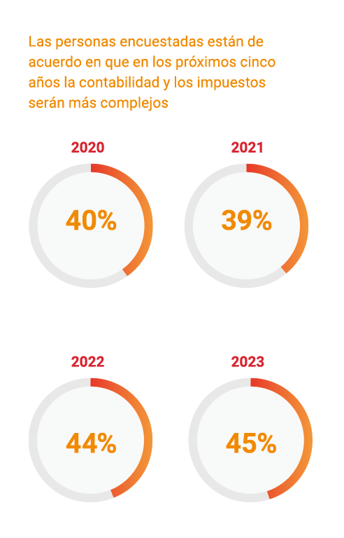 Sin embargo, estas dos áreas se vuelven cada año más complejas. En 2020, el 40 % de los expertos en contabilidad e impuestos de TMF Group en todo el mundo afirmaron que preveían que el cumplimiento normativo se volvería más complejo en los próximos cinco años. Esta cifra no ha dejado de aumentar desde entonces hasta alcanzar el 45 % en 2023, lo que demuestra que muchas organizaciones se enfrentan a una carga operativa mayor que hace tres años, y que puede volverse más onerosa en los próximos años.