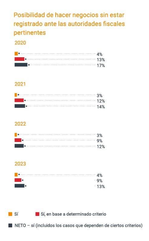 Año tras año, las normas contables y fiscales son más estrictas. Por ejemplo, ahora no es tan habitual poder hacer negocios sin estar registrado ante las autoridades fiscales pertinentes: esto sólo será posible en el 13 % de las jurisdicciones a nivel mundial en 2023. Esto incluye jurisdicciones como las Islas Caimán y EE. UU., donde hacer negocios suele ser más simple y los gobiernos trabajan activamente para que todas las fases de constitución y funcionamiento de una empresa sean lo más sencillas posible.