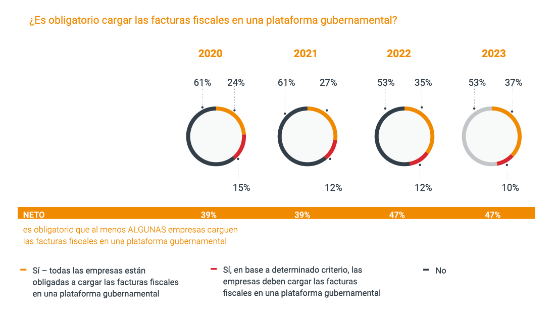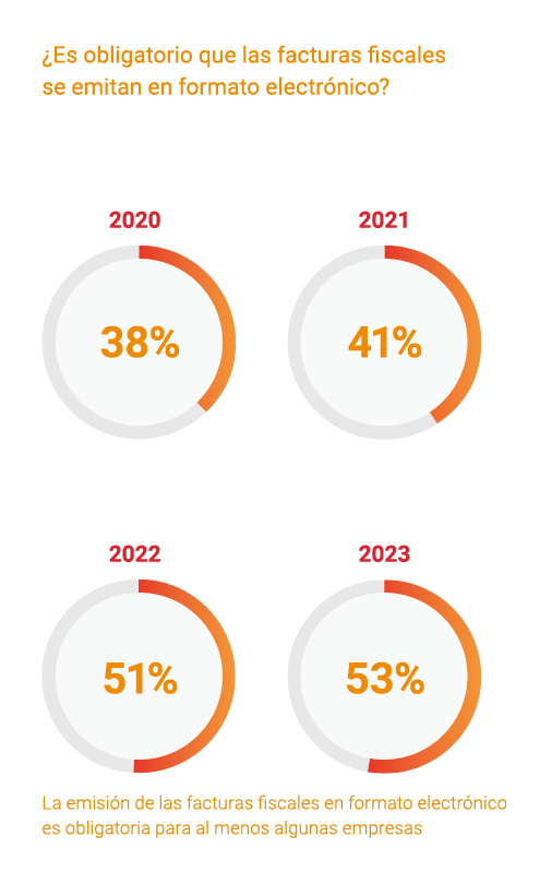 Desde 2020, es cada vez más común que los gobiernos exijan la emisión y carga digital de las facturas fiscales. Por ejemplo, en 2020 solo el 38 % de las jurisdicciones exigían que al menos algunas organizaciones emitieran facturas fiscales electrónicamente, porcentaje que aumentó al 53 % en 2023. Del mismo modo, en 2020, solo el 24 % de las jurisdicciones exigían que todas las organizaciones cargaran las facturas fiscales en una plataforma gubernamental, porcentaje que aumentará al 37 % en 2023.