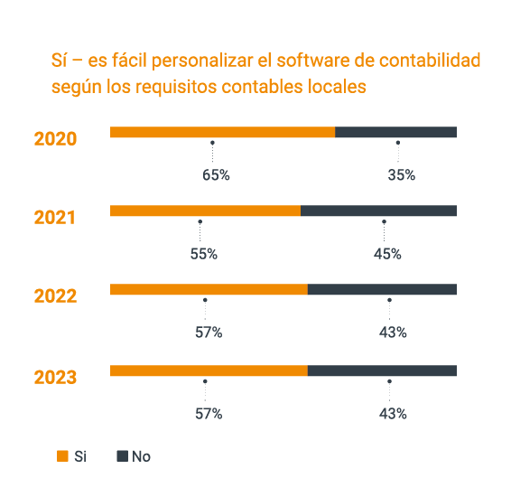 Por otro lado, la digitalización también puede acarrear su propia complejidad. Por ejemplo, cada vez es más difícil adaptar el software contable a los requisitos locales: nuestros expertos en el 43 % de las jurisdicciones indican que no es fácil, frente al 35 % en 2020. Esto demuestra que, a medida que la digitalización se integra más en todo el mundo, las organizaciones pueden enfrentar desafíos a la hora de alinear su software contable y fiscal a nivel local.
