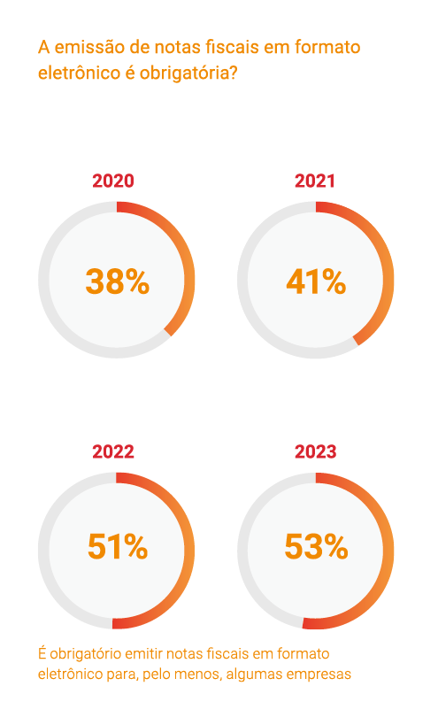 Desde 2020, tornou-se cada vez mais comum que os governos exijam a emissão e o upload de notas fiscais digitalmente. Por exemplo, em 2020, apenas 38% das jurisdições exigiram que pelo menos algumas organizações emitissem notas fiscais eletronicamente, um índice que aumentou para 53% em 2023. Da mesma forma, em 2020, apenas 24% das jurisdições exigiram que todas as organizações fizessem o upload de notas fiscais em uma plataforma do governo, um número que aumentou para 37% em 2023.